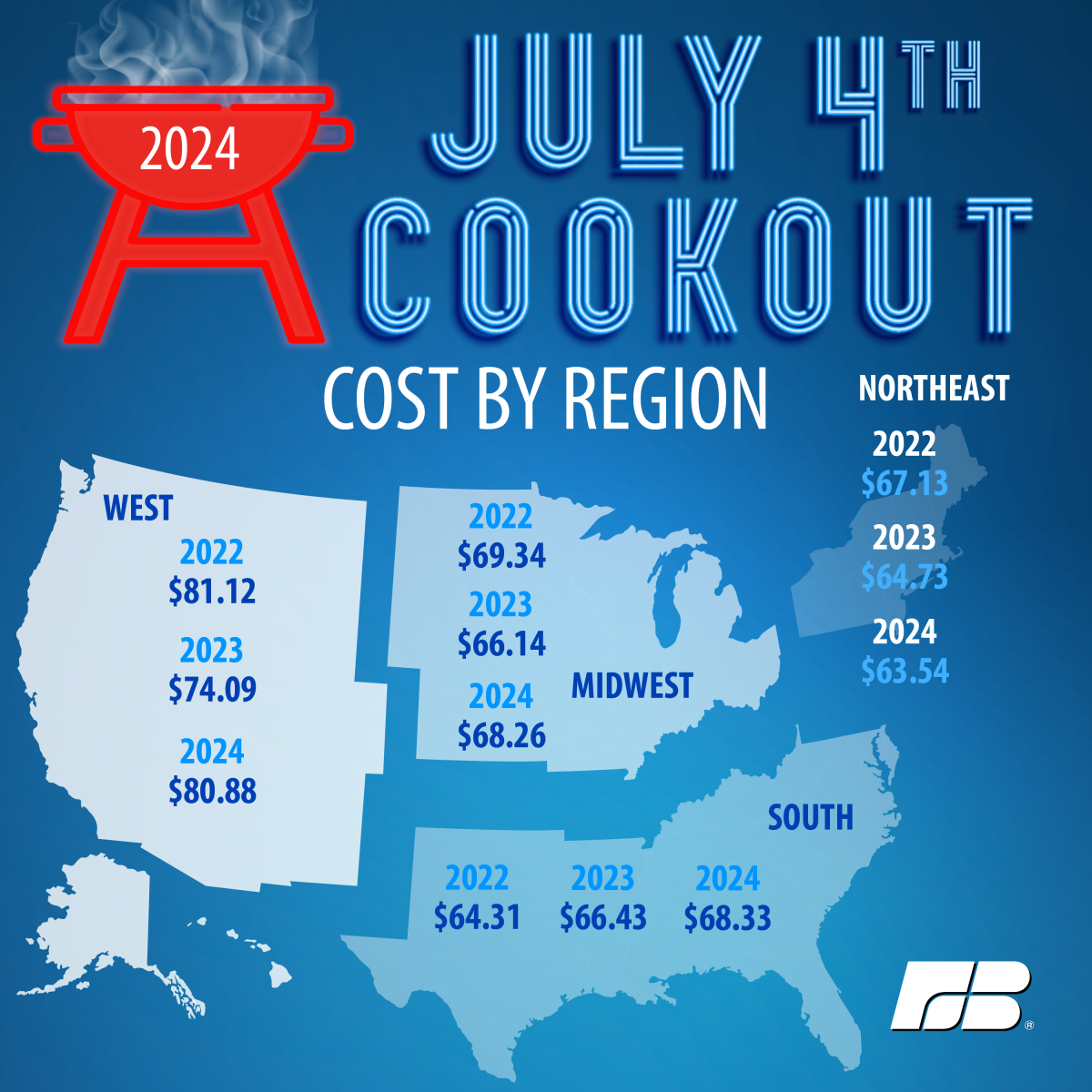 The cookout will cost an average of $68.33 in the South, $68.26 in the Midwest, $63.54 in the Northeast and $80.88 in the West.