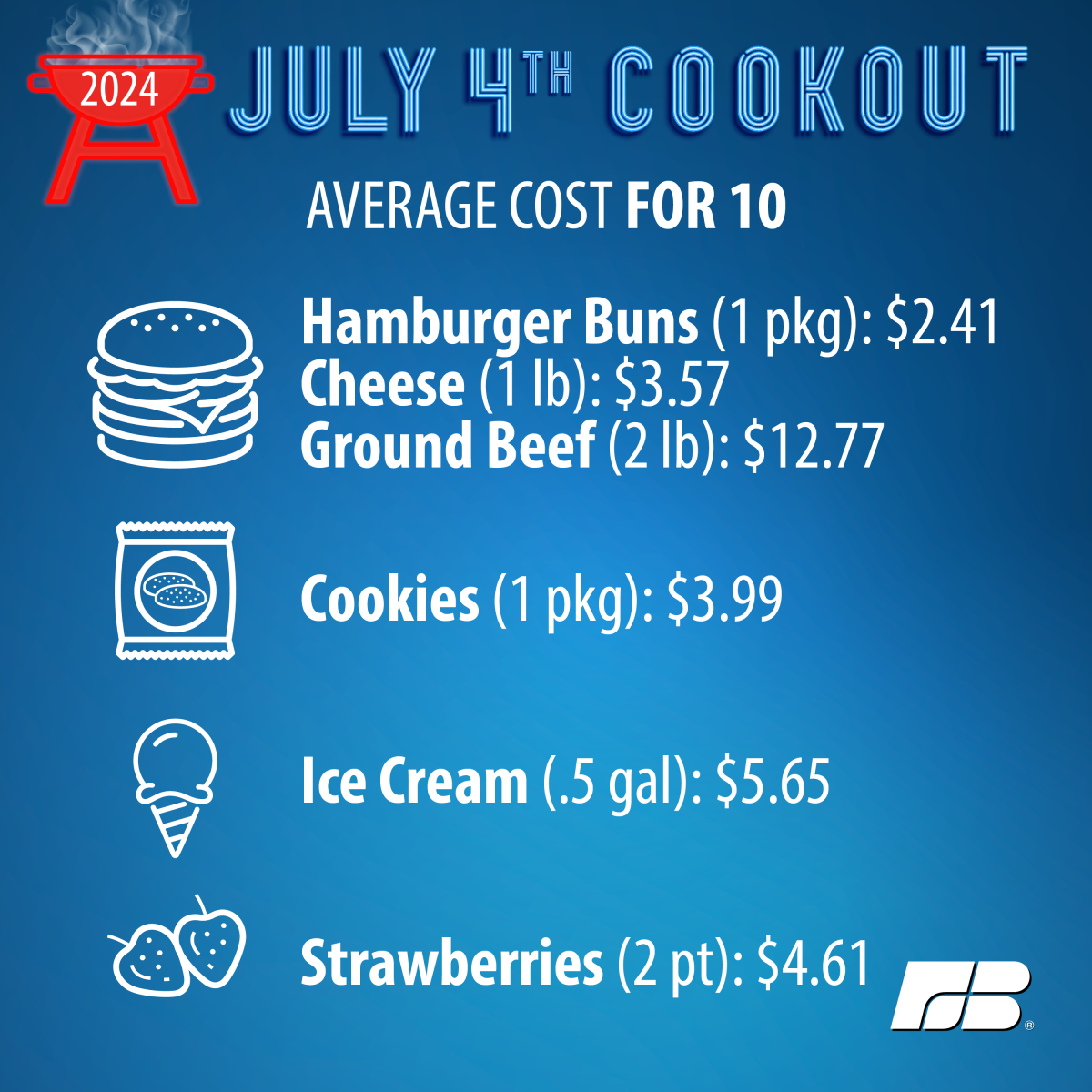 Families celebrating the 4th of July holiday will continue to find stubbornly high prices at the grocery store. The national average for an Independence Day cookout will cost $71.22 for 10 guests this year, based on the 2024 American Farm Bureau Federation annual marketbasket survey.