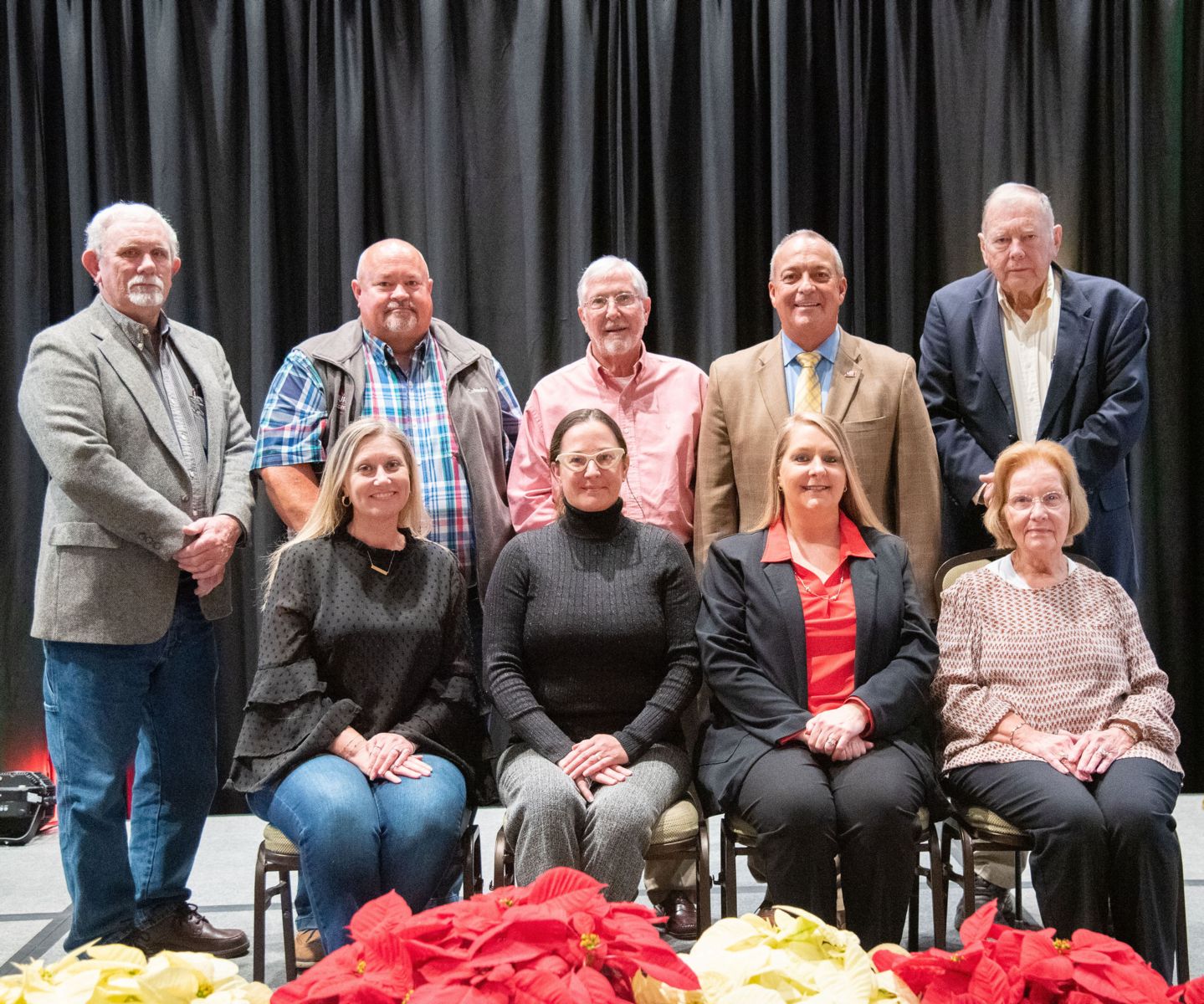 County Farm Bureaus receiving the REAP Harvester Award in GFB’s medium membership category were Berrien, Harris, Jeff Davis, Monroe & Screven. County office managers accepting the awards were: seated from left, Beth Reddick, Screven; Sandi Williams, Monroe; Regina Barton, Jeff Davis; & Vanna Boykin, Berrien. Not pictured Linda Luttrell, Harris. County presidents accepting the awards were: standing from left, Joe Boddiford, Screven; Clete Sanders, Monroe; James Emory Tate, Jeff Davis; Linwood Rowan, Berrien; & Gilbert Andrews, Harris. / Photo by Logan Thomas