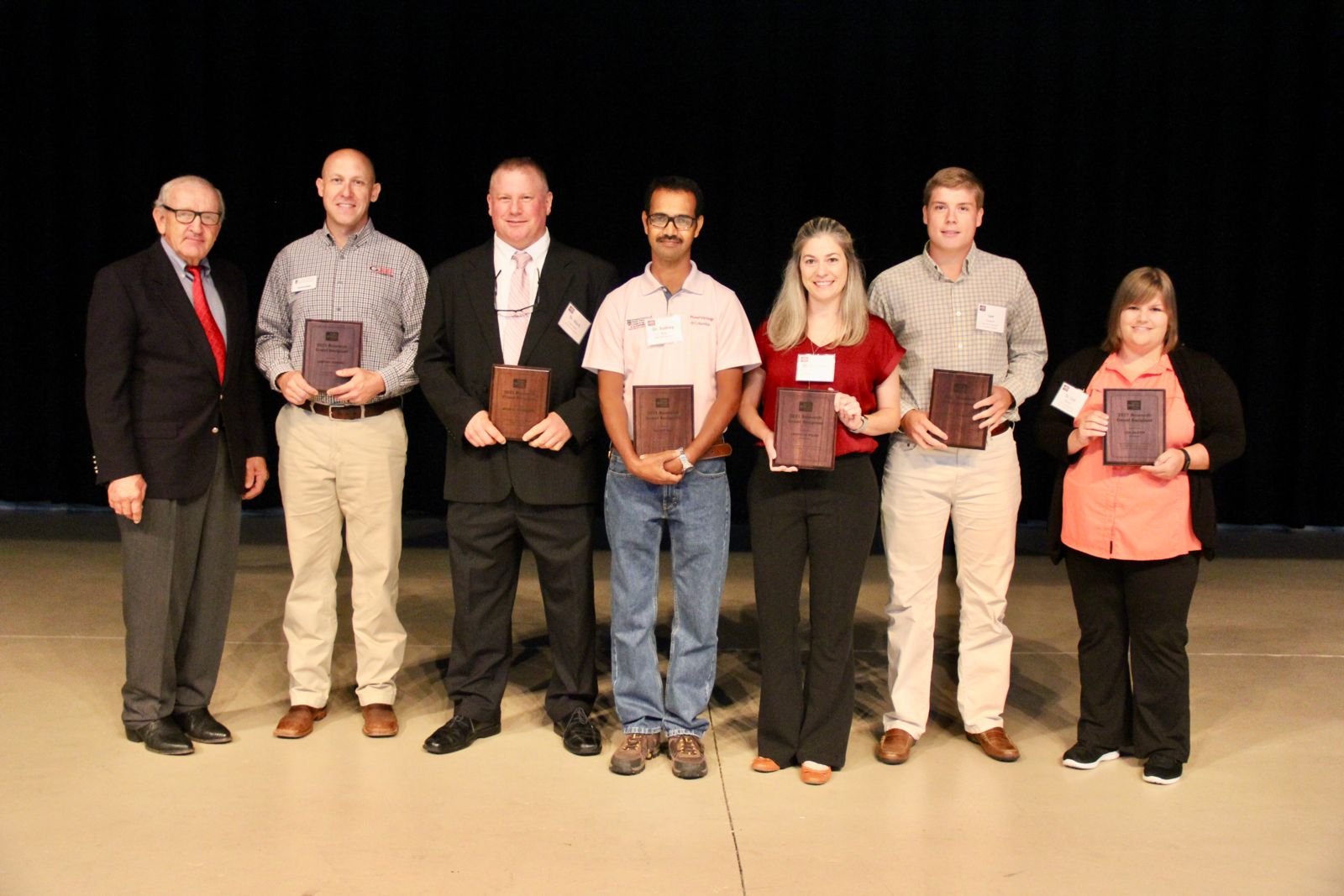 Pictured from left, GFB President Tom McCall congratulates recipients of the Georgia Farm Bureau 2021 Research Grants recognized at the GFB Commodity Conference: Dr. Lawton Stewart (beef grazing research); Mark Czarnota (Christmas tree research); Dr. Sudeep Bag (cotton disease research); Cristiane Pilon (peanut water use research), Lee Cowart accepting on behalf of Dr. Cesar Escalante (labor research) & Dr. Lisa Baxter (forage research). Not pictured: Dr. Alex Stelzleni (beef product research); Dr. Kari Turner (development of a livestock program for ag teachers) & Dr. Emran Ali (blueberry research).