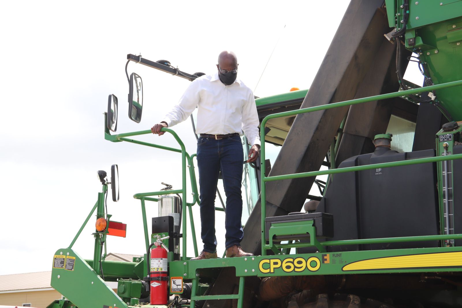 Sen. Raphael Warnock checks out a cotton combine during the tour. Photo by Jay Stone