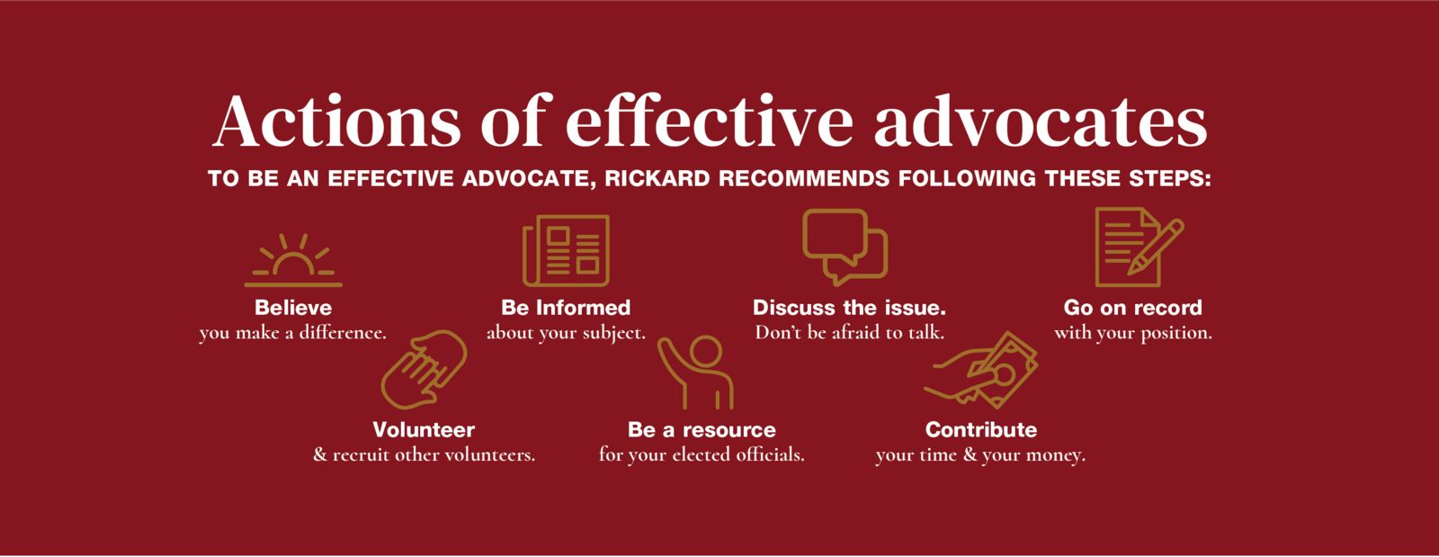 Donating to a candidate or a political action committee that supports your beliefs and values is also an important part of advocacy Rickard said.