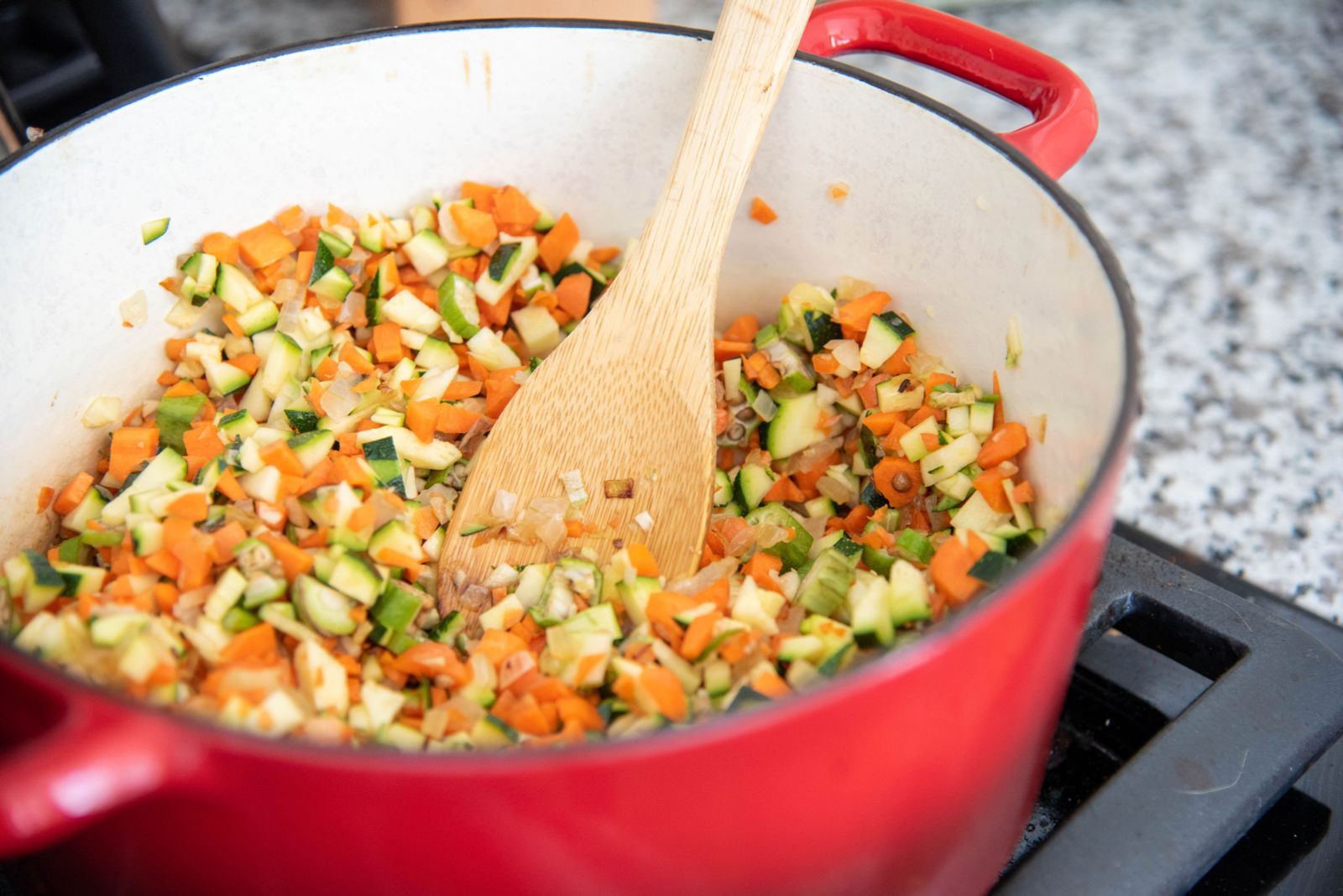 - Add diced carrots, celery and zucchini to onion and garlic mixture. Saute additional 6-7 minutes or until slightly softened.