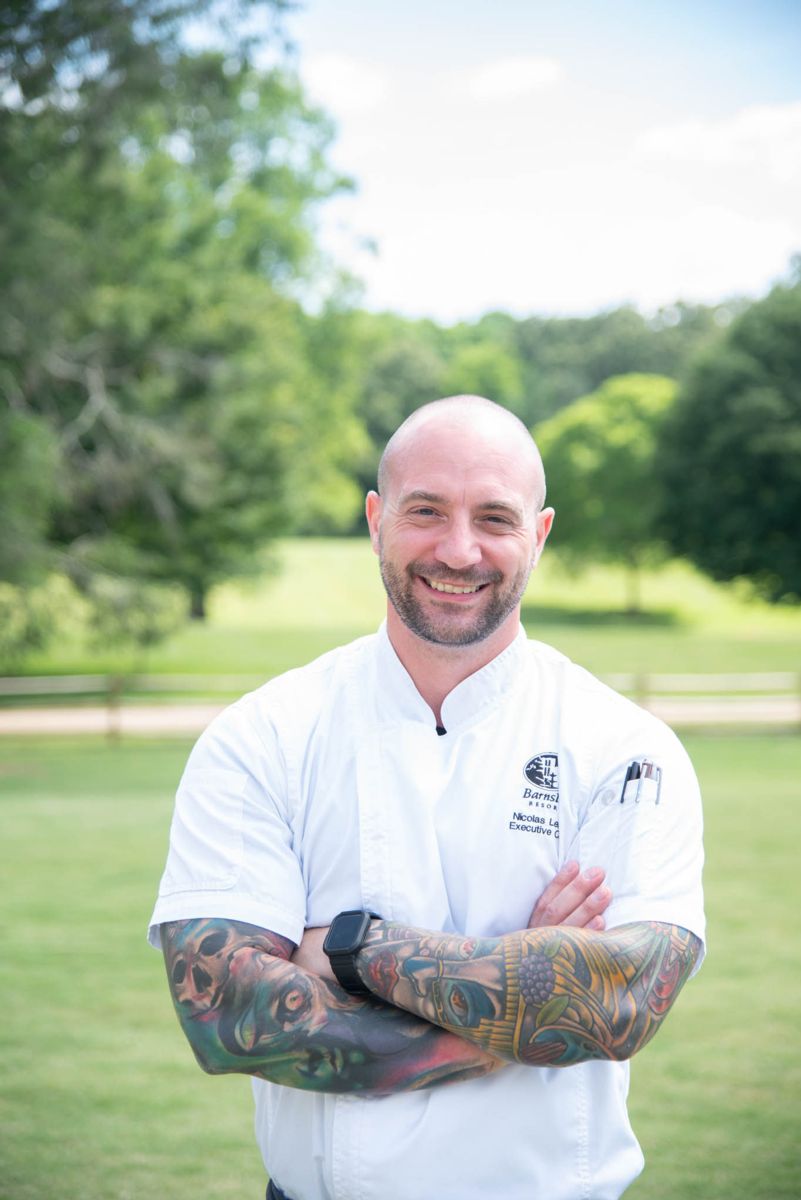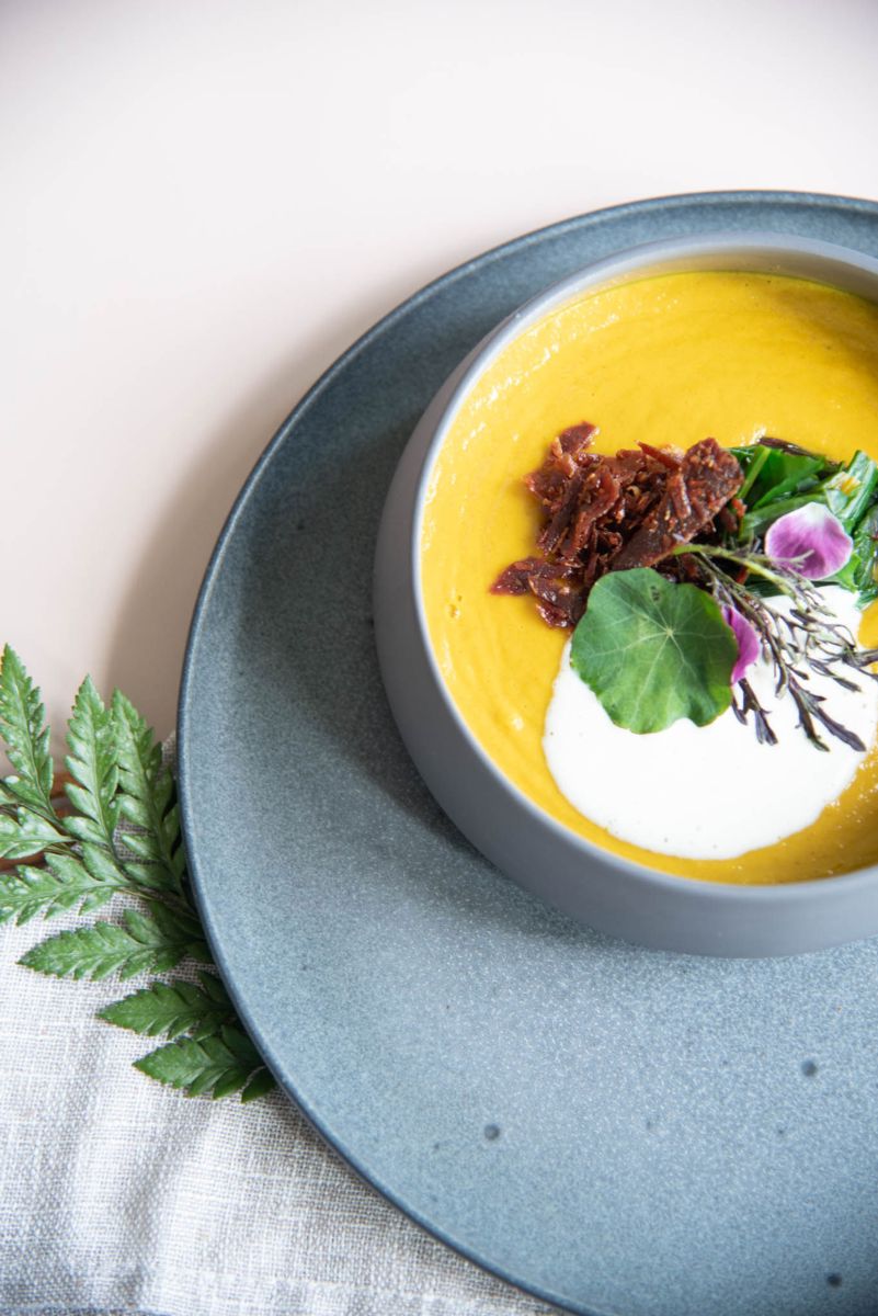 This Cream of Butternut Squash Soup with Goat Cheese Espuma, Collard Greens, and Goodnight Brother's Crispy Country Ham recipe is brought to you by Barnsley Resort Executive Chef, Nicolas Lebas.