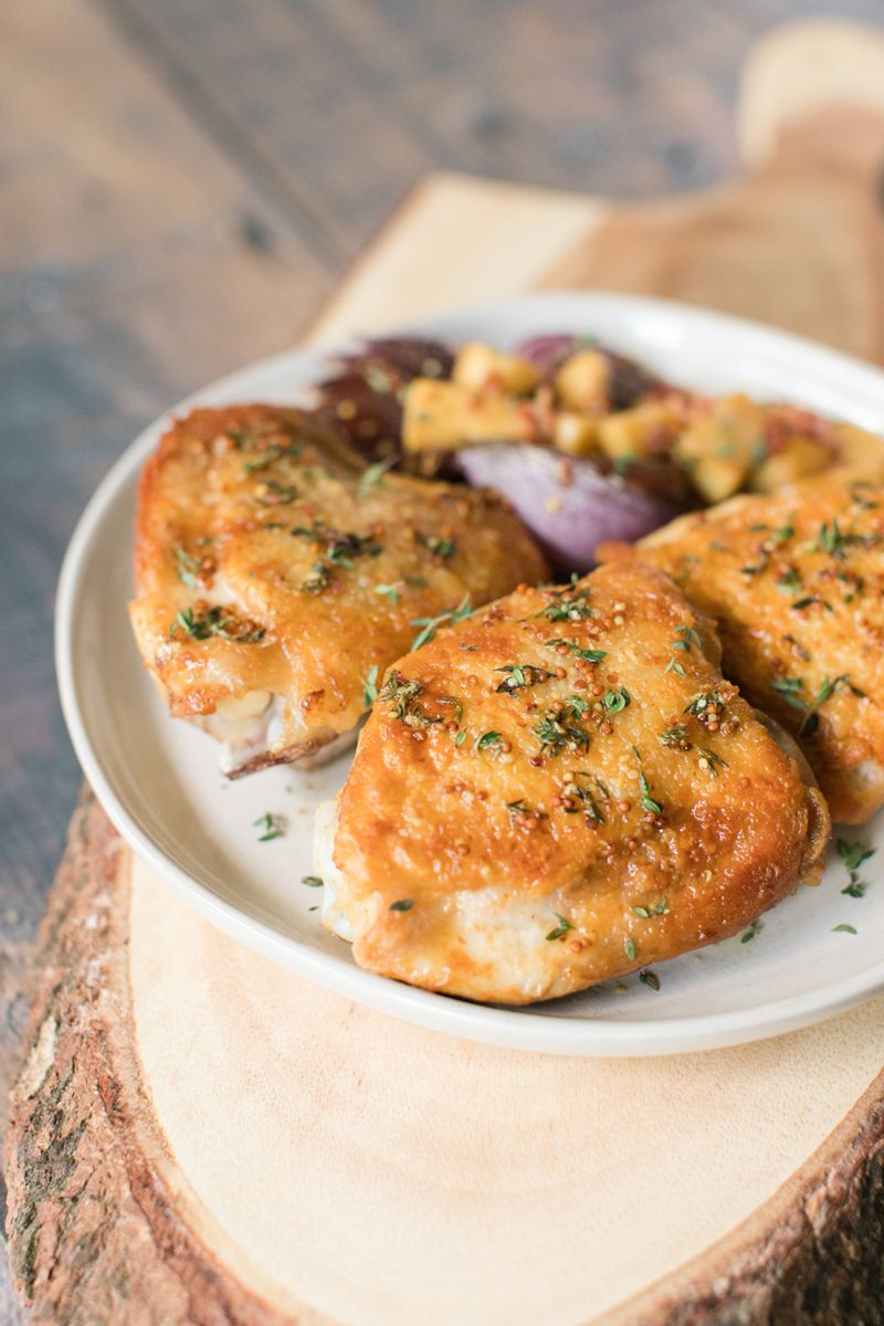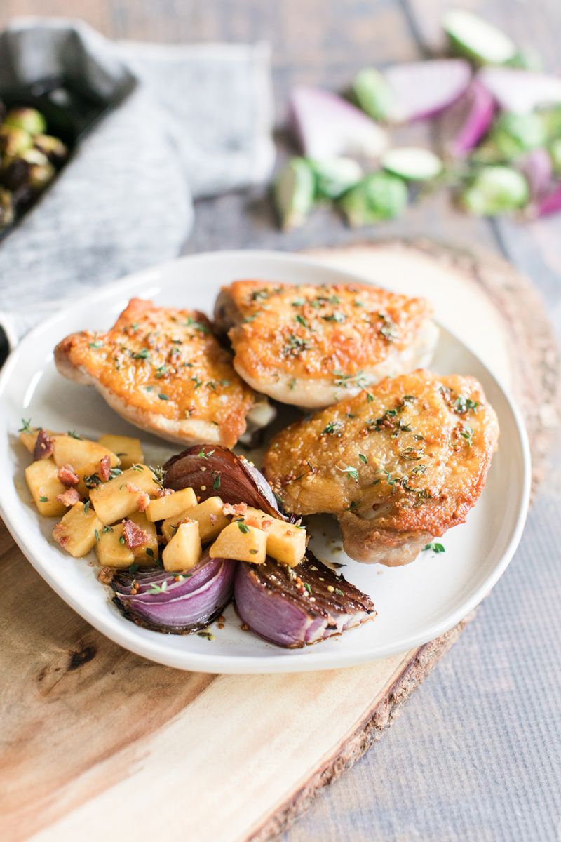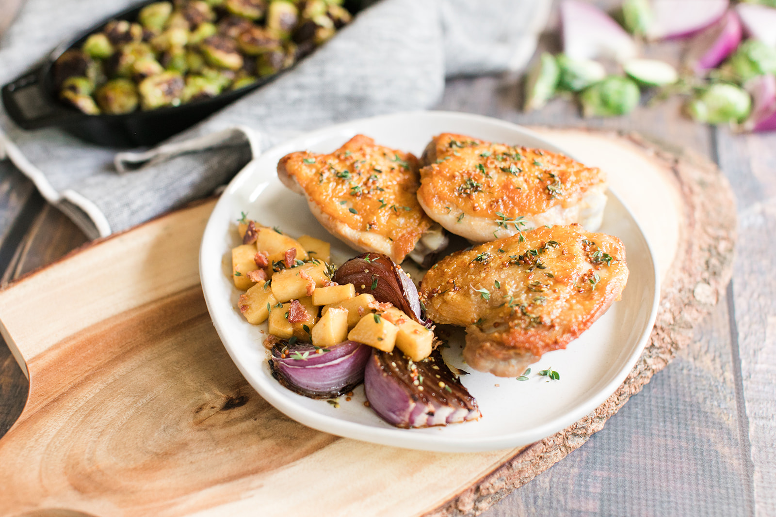 To serve, divide chicken thighs, roasted onions and apples among shallow bowls or plates. Spoon cider mixture over the top and garnish each serving with bacon and remaining fresh thyme.