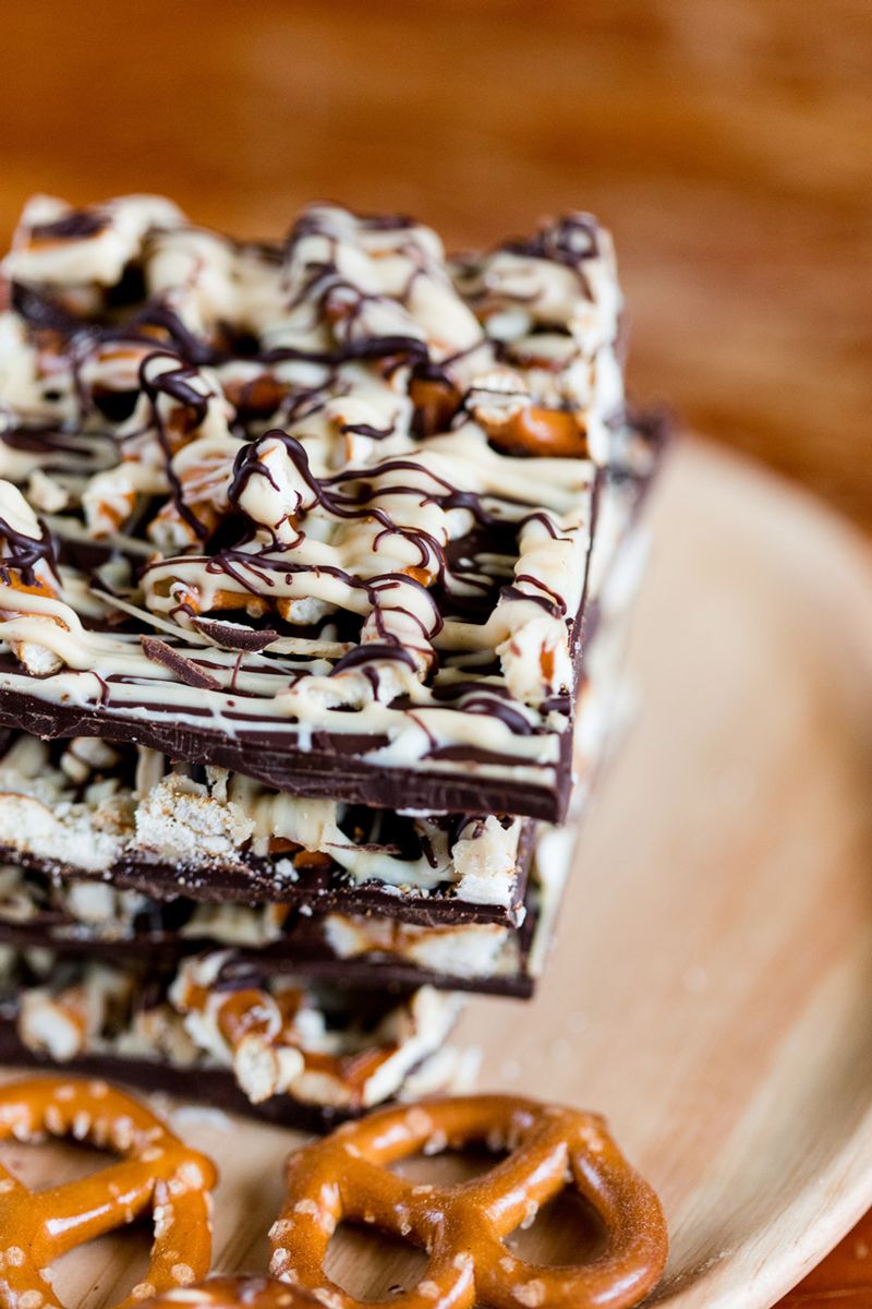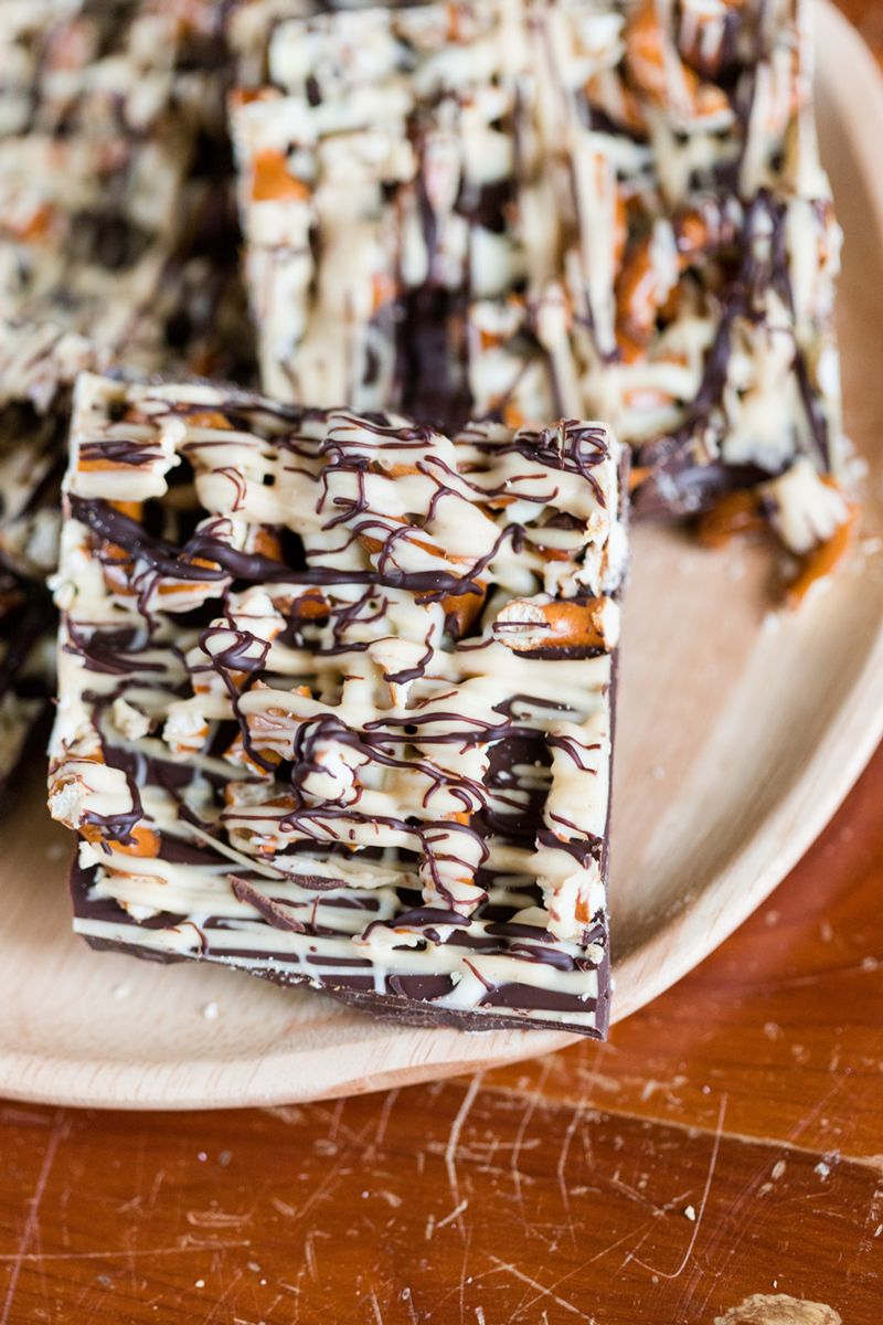 Spread the chocolate mixture evenly over the waxed paper. Sprinkle with 1½ cups of the pretzels. Drizzle the white chocolate over the top. Drizzle the peanut butter mixture over that and used a knife to swirl the mixtures together gently. Sprinkle the remaining pretzels over the top and press lightly.